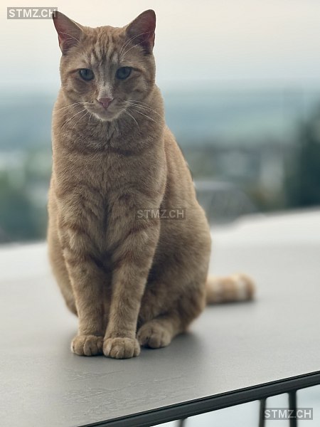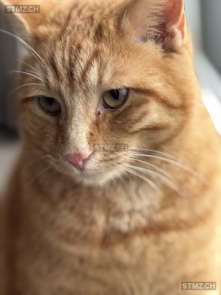 M-förmiges Muster auf der Stirn; grün-goldene Augen; grosse kräftige Statur, dichtes Fell; auffällig schöne rosa Nase mit kleinen braunen Punkten und hellem Bereich um die Schnauze; sehr verschmust, menschenbezogen, immer auf Futtersuche; Freigänger, sonst nur wenige Stunden weg. WICHTIG: herzkrank und braucht 2× täglich dringend Medikamente