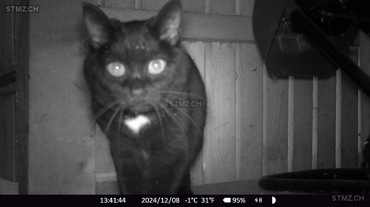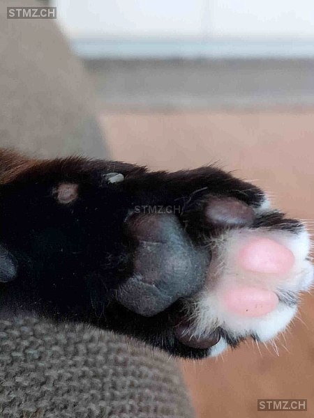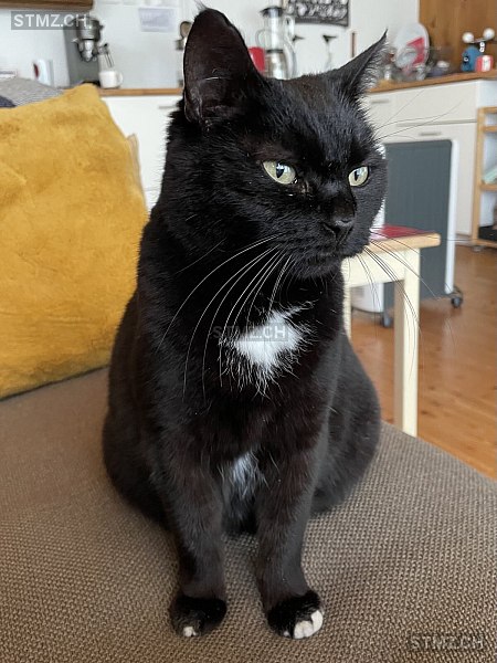 Schwarze Hauskatze, weiblich, schlank, eher scheu, an beiden Vorderpfoten eine bis mehrere weisse Zehen, weisse Stellen an Brust und Bauch, Haarlooser Blätz (Stelle) an rechtem Hinterbein, gechippt