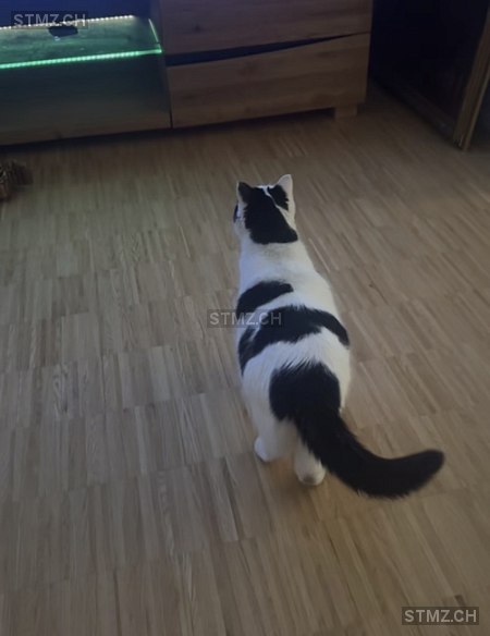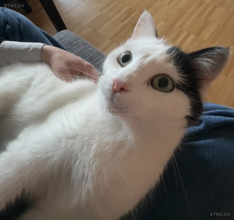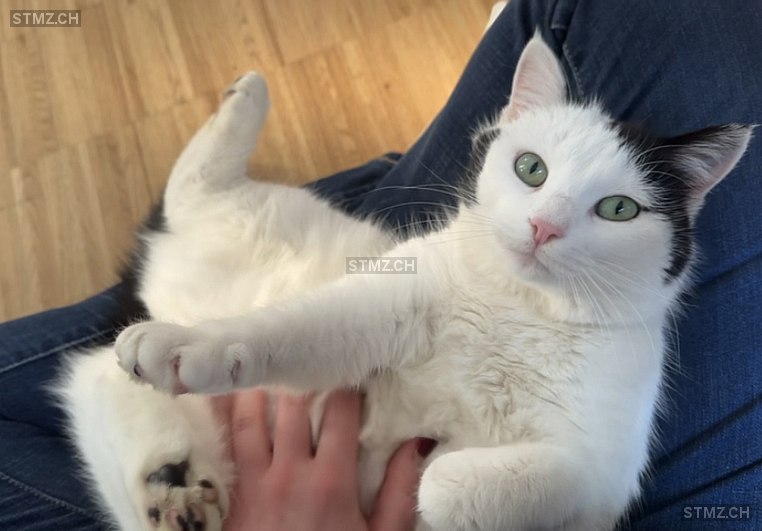 Grüne Augen. Schwarzer Fleck auf rechter Gesichtsseite. Jagt gerne und versteckt sich wo es nicht laut ist!